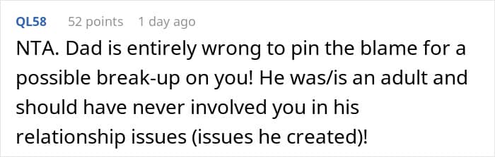 OP says that his dad pulled him aside a few days later, telling him that, if he gave it a chance, they could be really happy together but, if things didn’t change, the marriage might be in jeopardy. OP doubled down, telling him he had no intention of changing his stance and that it wasn’t his fault his dad had made a stupid decision.