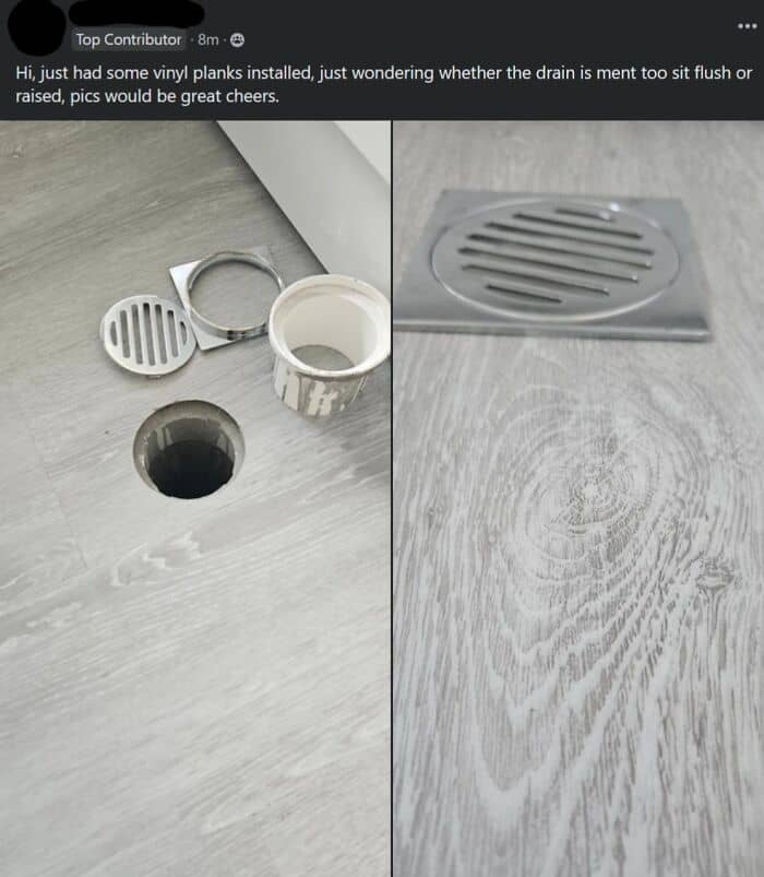 Hi. I just had some vinyl planks installed. I was wondering, was the drain meant to sit flush, or should it be raised. Pictures would be helpful. Cheers!