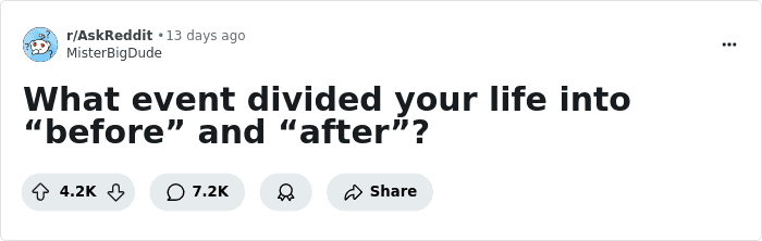 A canon event is a transformative moment that redefines you as a person. It can range from heartbreak to triumph—the loss of a loved one, a promise to get sober, or landing a dream job. Reddit user MisterBigDude asked the platform to share what divided their lives into a clear “before” and “after.”