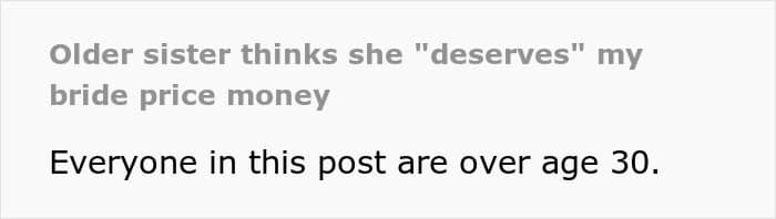 The poster had also forgone the traditional “bride price” that women are given, so she was shocked when her older sister tried to get that money for herself