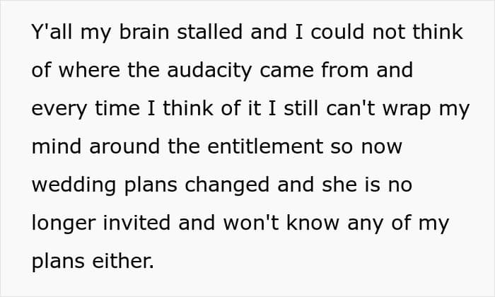 It’s difficult to deal with a greedy sibling like this, and it seems like this situation was just the straw that broke the camel’s back, as the poster decided to uninvite her sister from her wedding. Although going no-contact or cutting loved ones off isn’t the first thing you should do, it makes sense if they keep trying to force their point of view.