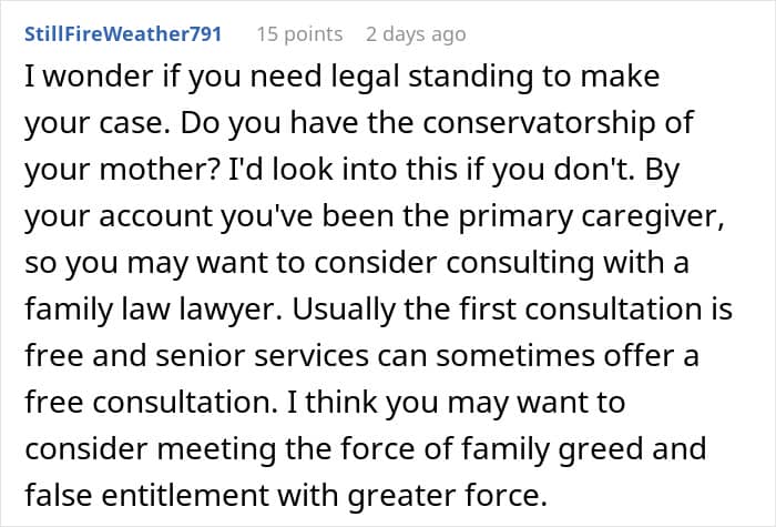 The poster had been a caretaker for her parents almost all her life, with no support from her siblings, so she was shocked by her sister’s entitlement to the money