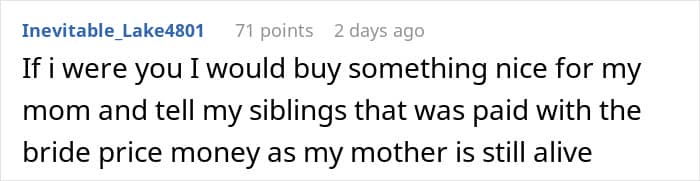 What shocked the woman the most was when her overbearing older sister demanded she get the poster’s “bride price,” as she deserved it the most. She claimed that she had helped take care of the OP when she was younger, and that’s why the money should ideally be given to her.