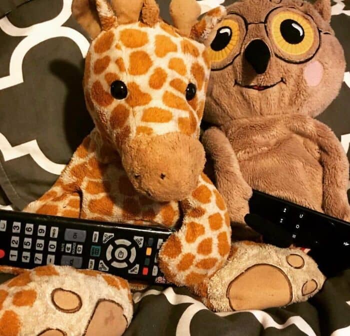 I use gorilla super glue – haven’t lost a remote since I started doing this 7+ years ago and I have 3 kids. And how cute is that – a giraffe and an owl holding a remote?! Adorable.