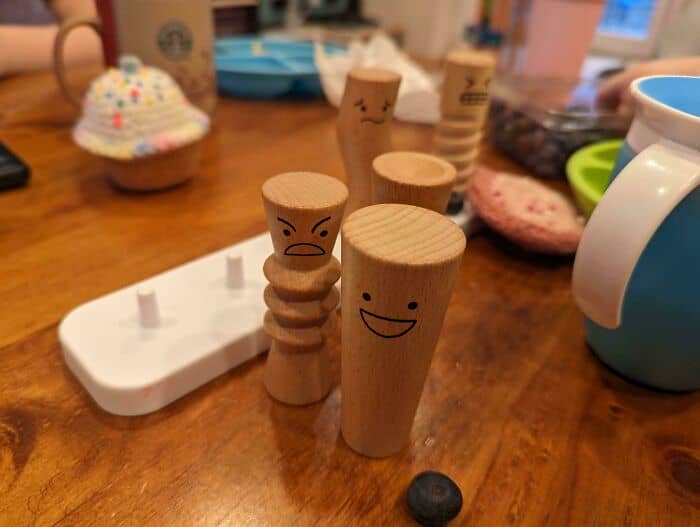 Toddler starts fussing. You ask them to get their emotion. They bring sad or mad to you and it causes them to acknowledge their emotion and start to deal. And they play with them. It’s so amazing. It’s lovevery so expensive. But worth getting second had if possible. Or maybe find a ripoff or make your own. Might be a fun lathe project.