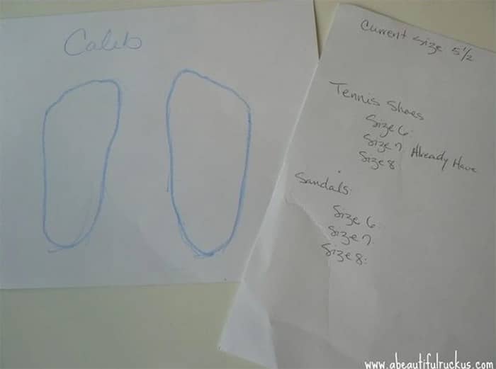 Every time I go to a sale, I pop a piece of card stock on the kitchen table, and Sean holds the kids’ feet in place while I trace them. I make sure that I trace them in their color and write their names at the top so that I can keep track of who I’m trying shoes on.