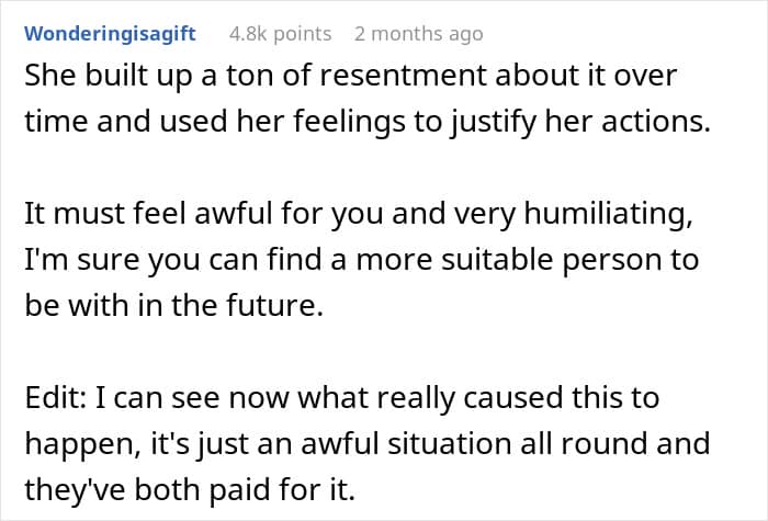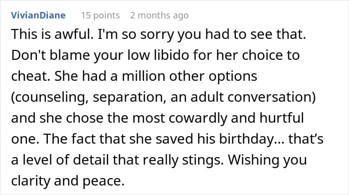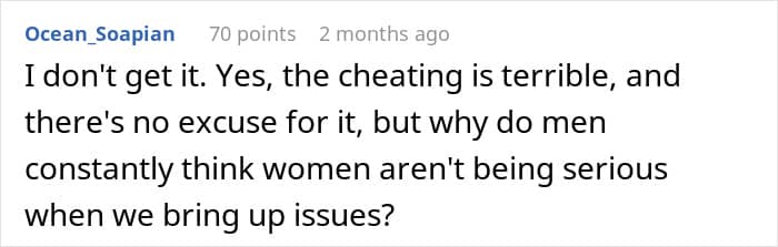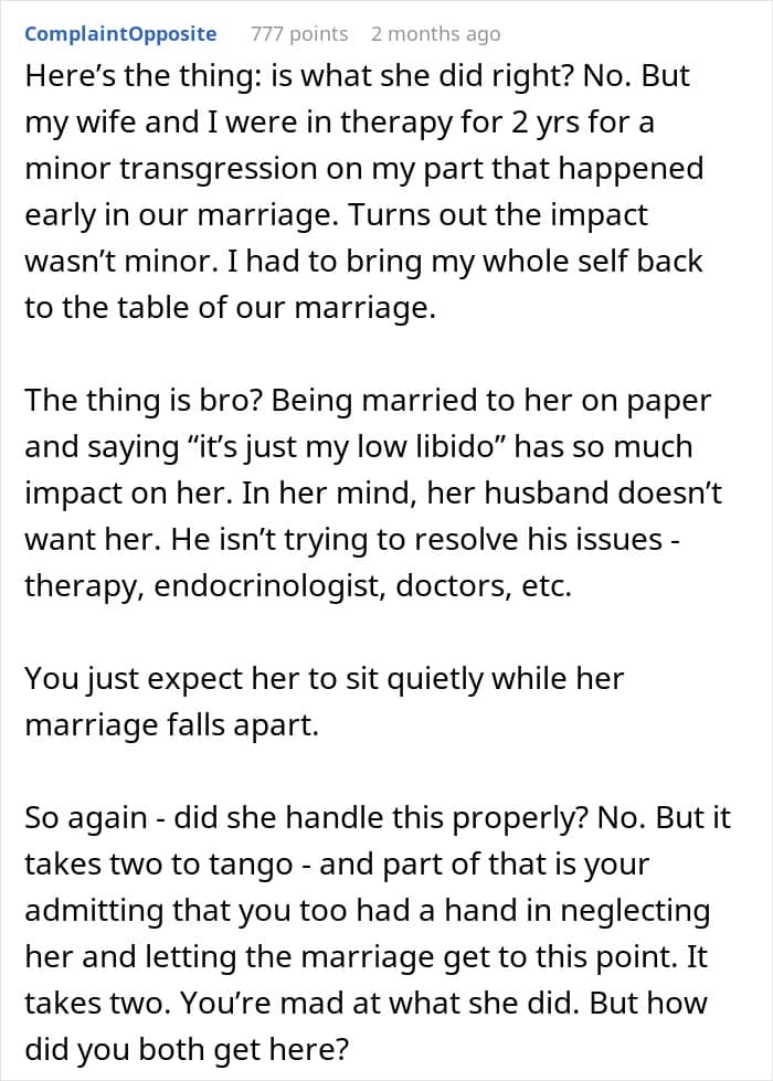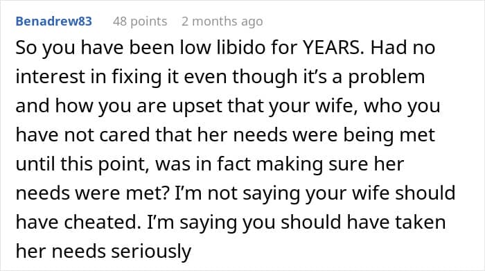 In this particular case, it seems the author may not have fully understood or addressed his partner’s needs, but that in no way gives her the right to cheat. Relationships are complicated, and unmet needs can cause frustration or distance, yet betrayal is a choice. Both sides may have made mistakes, but trust and respect remain non-negotiable. What are your thoughts on this situation? How would you handle something like this in a relationship?