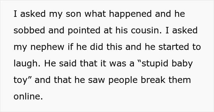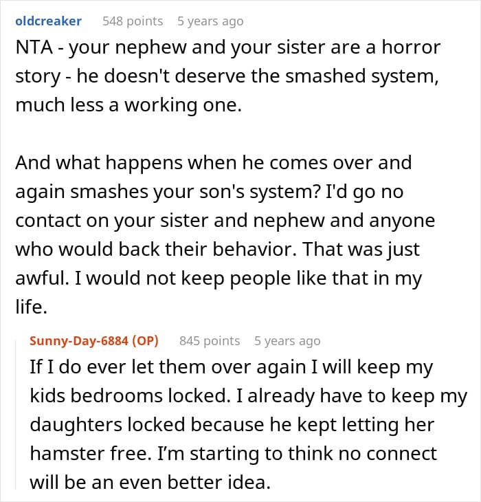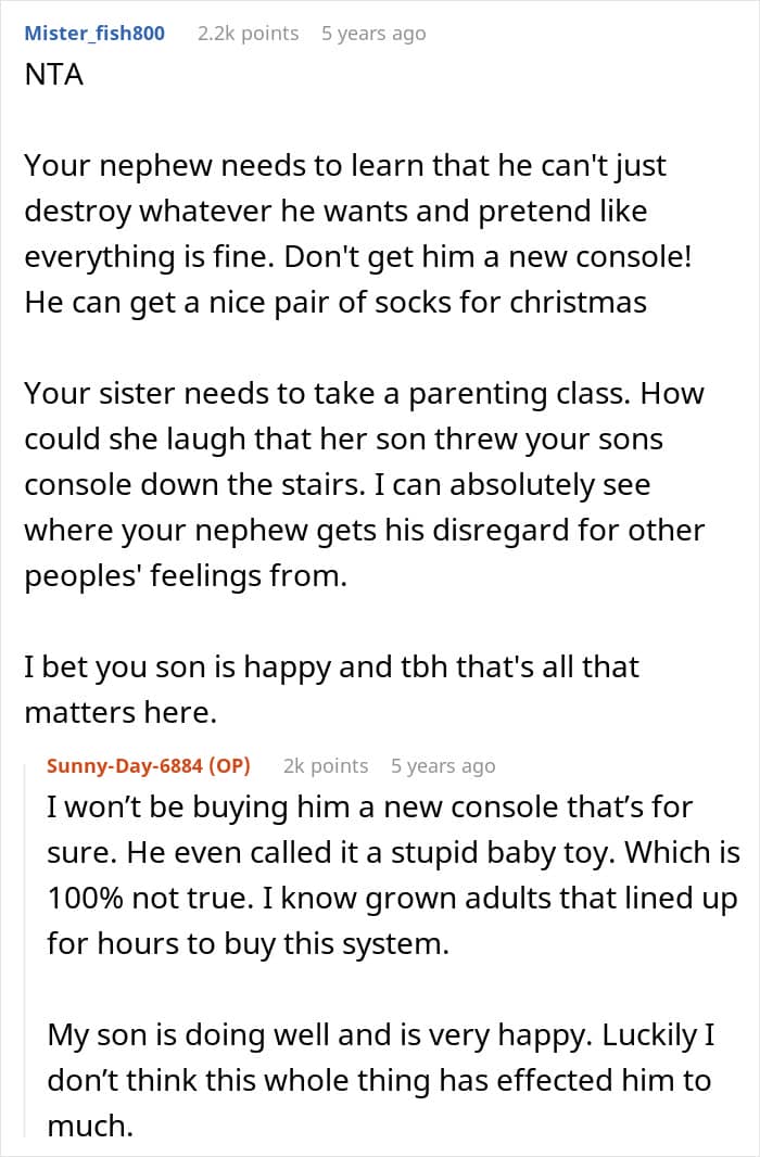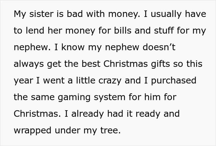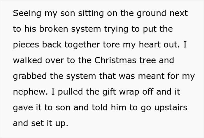 This parent still went out of their way to buy their nephew an expensive gaming console, the same one their son already had. However, when the little menace broke his cousin’s console and made him cry, the parent took away his present and gave it to their son. After their sister and family shunned them, they asked for unbiased opinions online: was the parent wrong to replace the son’s console with the nephew’s Christmas gift?