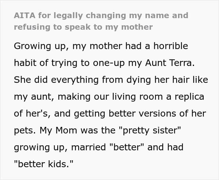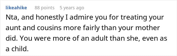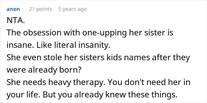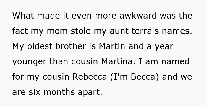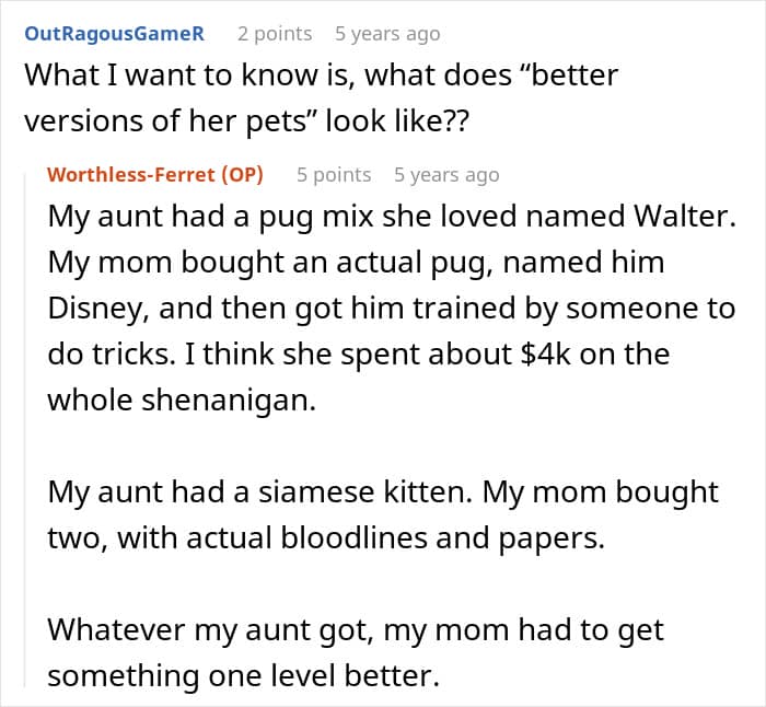 Reddit user Worthless-Ferret, however, got hers because of her mother’s desire to get back at her own sister—it was meant as a dig at her cousin.