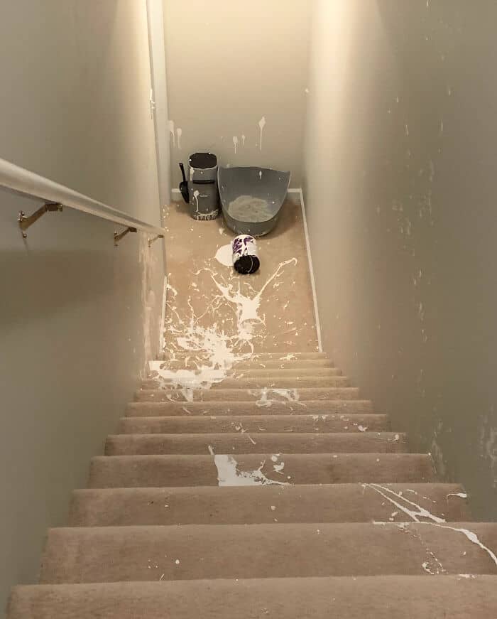 #14 Fiancé Was Being Thoughtful And Taking The Paint Cans To The Basement. Turns Out He Tried To Carry Too Many At Once