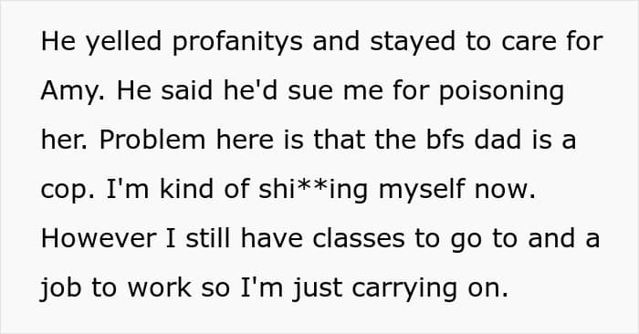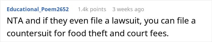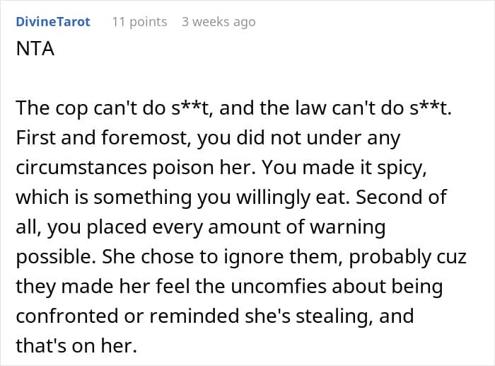At the end of the day, this is still a pretty surefire way to make sure her food isn’t stolen again, although at the cost of now having an entirely hostile roommate. There is little to no chance there will be any legal action, unless Amy is willing to lose a lot of money, but it’s also worth considering the risks of antagonizing a person already willing to steal and who has the disposable income for takeout.
