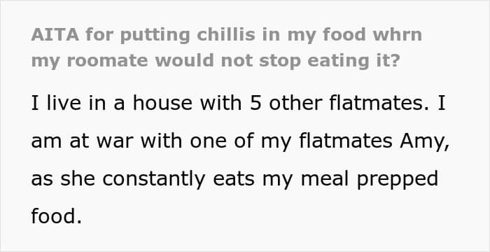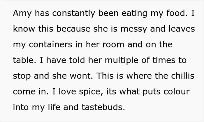 A woman asked the internet if she was wrong to lay a chili-infused trap for a roommate who would not stop stealing her food. We reached out to the woman who shared the story online via private message and will update the article when she gets back to us.