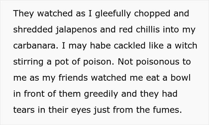 However, as this story demonstrates, some folks can’t handle the heat at all. While in this day and age, not being able to handle black pepper is rare, there are still folks who are just over sensitive. While the roommate in this story is clearly the villain, let’s also take a moment to consider just how hard it is to live if you can’t handle the slightest bit of spice. No pepper, no chili, no paprika.