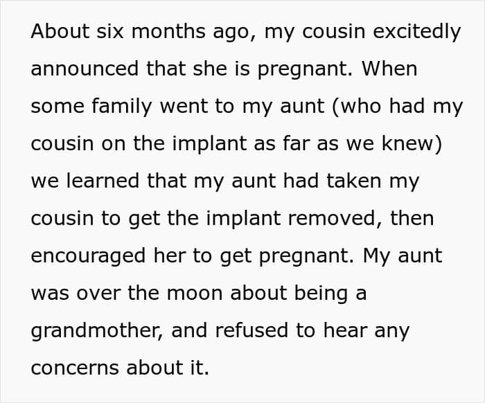Six months ago, the cousin became pregnant after her mother removed her contraceptive implant and encouraged the pregnancy, despite family concerns about her ability to parent