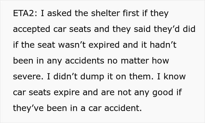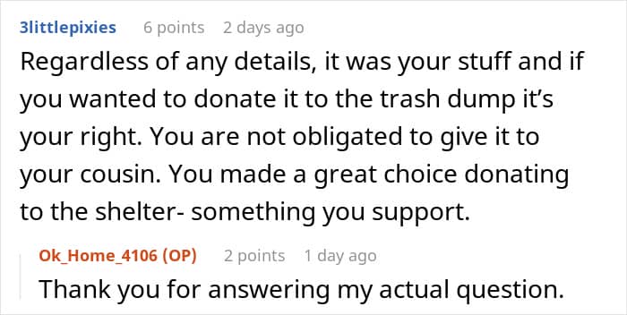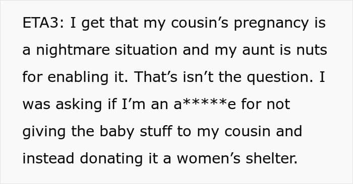 Concerns over how the cousin could possibly handle a newborn went unheard. The aunt brushed off every protest, focusing only on her excitement. Meanwhile, the OP decided to do something kind by donating her old baby items to a local women’s shelter. Somehow the news made its way back to her aunt, who erupted in anger and asked why she hadn’t offered those things to her cousin instead.