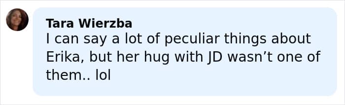 The hug that followed became the centerpiece of controversy. Erika tightly embraced JD, moved her hand to the back of his head, and he placed his hands briefly on her waist.