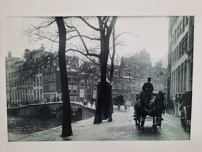 The building on the corner here isn’t facing into the canal that’s heading to the right; instead the building is facing to the left.It’s also a rather unusual double-gabled building – rather than two separate buildings side-by-sideTo the left of that building on the corner are a several buildings with flat root profiles – that’s pretty unusual in Amsterdam, where most buildings have the classic Dutch stepped or peaked gablesThe kiosk with the conical top in the foreground is still there (as is the lamp in front of it!)This isn’t a typical canal with bridge – it’s a T-intersection, where we’re looking along the curve of the canal, not just across to the opposite sideThe third or fourth house to the right of the corner one sticks up just a bit higher than the others