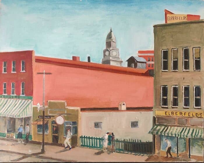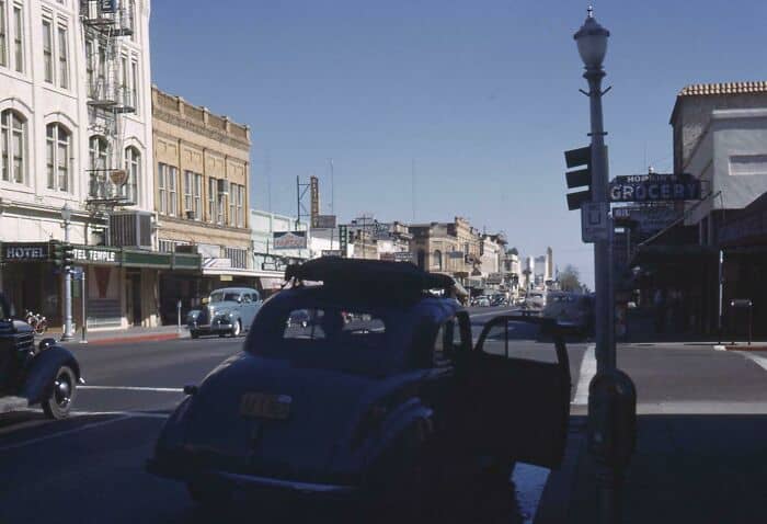 TheGoldenChow: Don’t take me for an expert, but a little google sleuthing points to this being the intersection of Market and Tehama Streets, looking south, in Redding California. I searched on the two easiest businesses to identify (Hotel Temple and Hopkin’s Grocery) and found a Facebook post by the Shasta County (CA) Historical Society showing this very same intersection circa 1910. Note the building adjacent to Hotel Temple looking the same in both photos as well as the grocery story looking to have almost the same sign, 40ish years apart.
