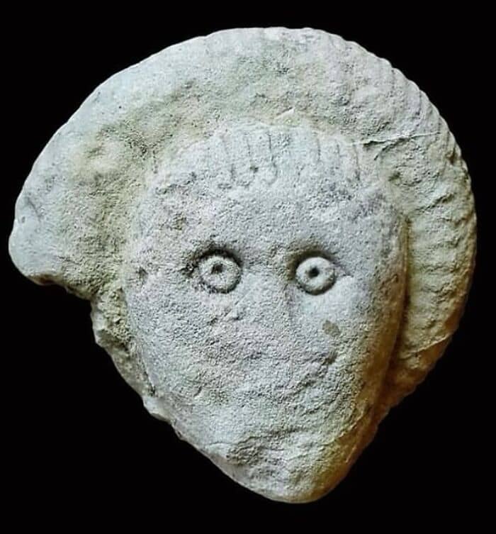 A Late Iron Age/Romano-British face carved into a beautiful Ammonite, the hair has been delibertly styled from the fossilized shell. This was found at Great Bedwyn in East Wiltshire and is now on display in Wiltshire Museum.