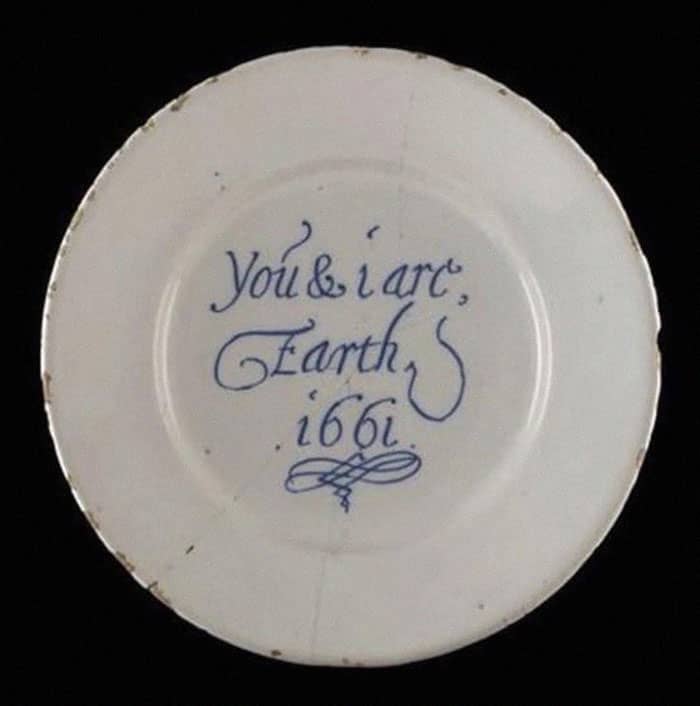#10 A Message For The One You Love Today: “You And I Are Earth”, 1661. Creator Unknown. Found In A London Sewer. Tin-Glazed Earthenware Plate. Collection Of The Museum Of London