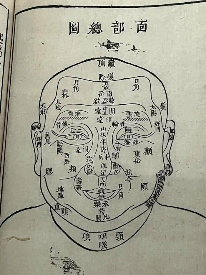 The face on this page is labeled with terms adapted from Chinese physiognomy—fortune-telling based on face reading. They include the sun and moon (eyes), mountains (nose and cheeks), and even clouds (eyebrows). Together, they transform the face into a miniature cosmos.