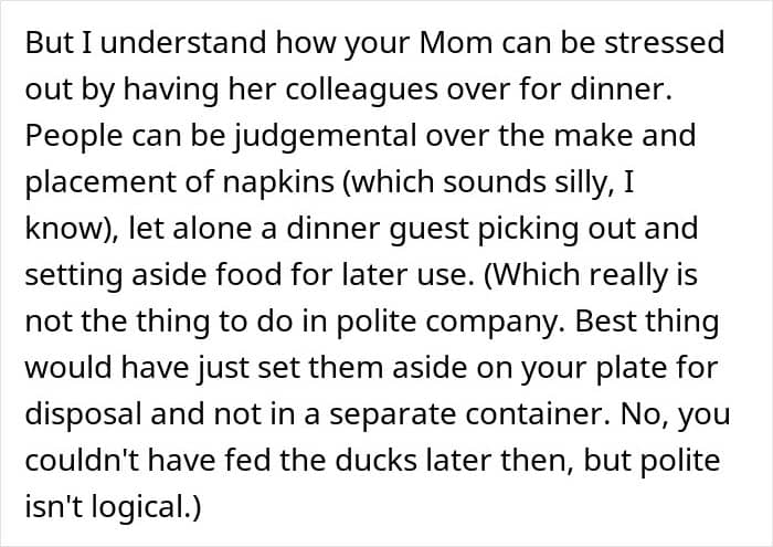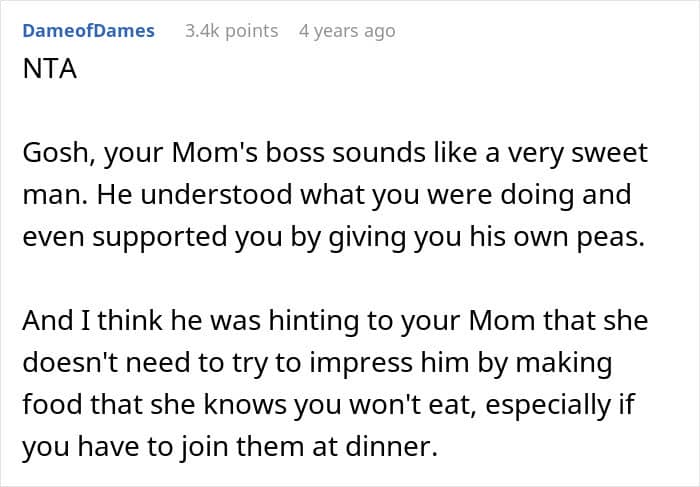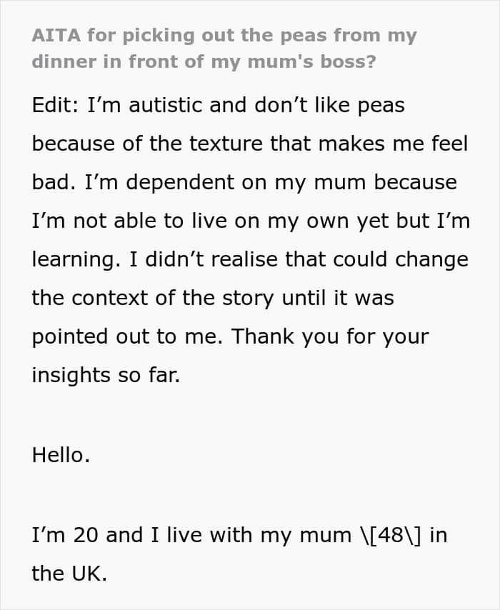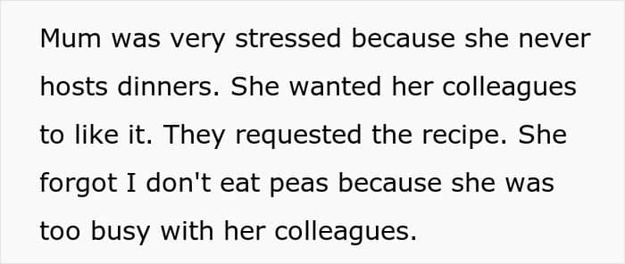 For people with autism, though, “reading the room” isn’t always straightforward. So when this Redditor joined his mother’s dinner with coworkers and was served a dish full of peas he couldn’t stand, he calmly picked them out. His mom, however, felt embarrassed watching it happen. Unsure why it caused such a reaction, he turned to the internet to ask if he was in the wrong.