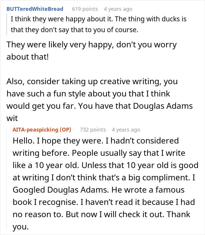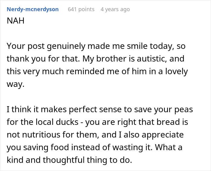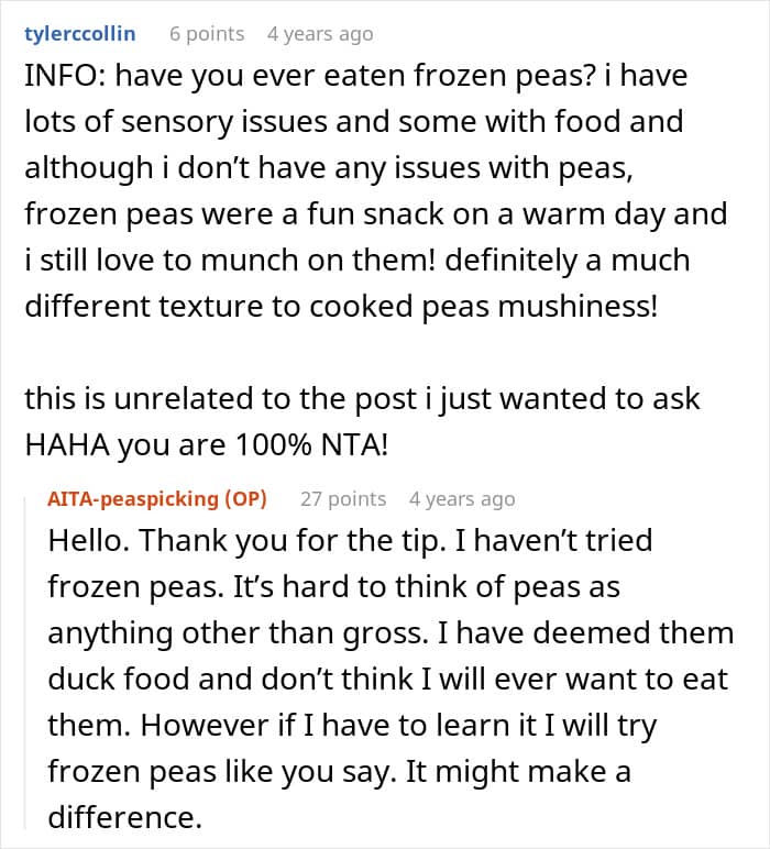 So for the author, not eating a food he dislikes felt like the simplest, most logical choice. Why eat something with a texture that feels overwhelmingly unpleasant? And to avoid wasting it, he collected the peas and planned to feed them to ducks. From his perspective, every part of that made perfect sense.