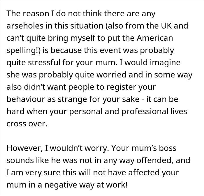 The important thing is that once everything was discussed, the man and his mother understood each other better and resolved the tension. And the warm reaction from her boss is a clear reminder of what happens when people assume good intentions and make space for different communication styles. There’s something everyone can take away from how supportive everyone chose to be.
