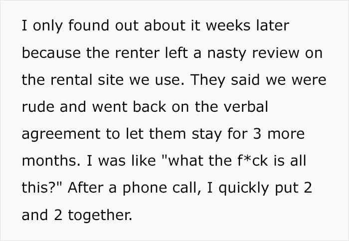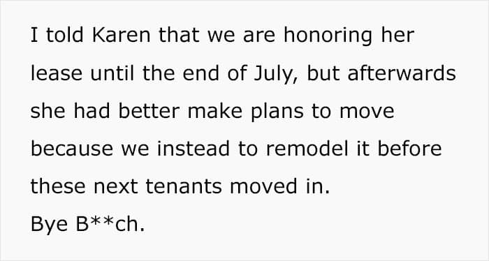 At first, things were going pretty smoothly. Karen paid her rent on time and wasn’t looking for a new place. u/Unique_username504 and her husband were not planning to renew the lease and suggested that Karen leave early, saying they would not ask her to pay the termination if she chose to do so.