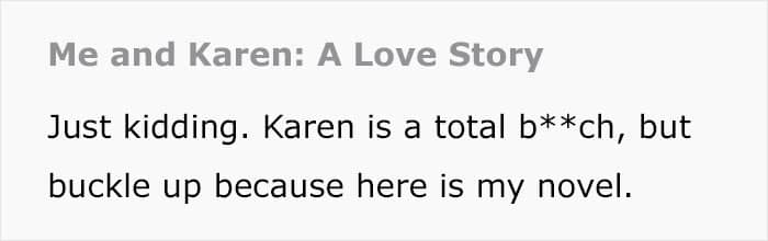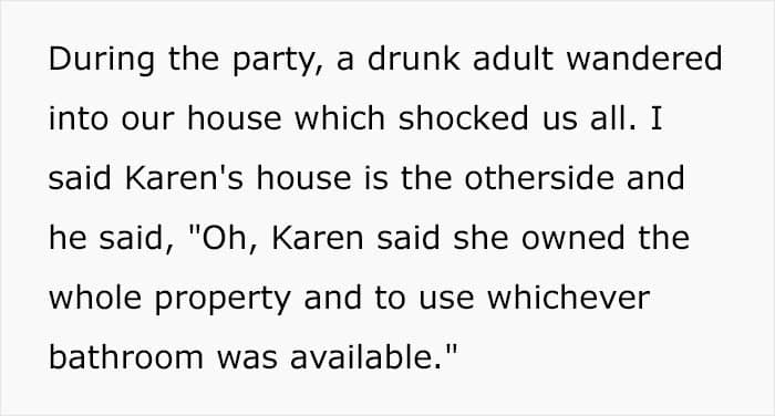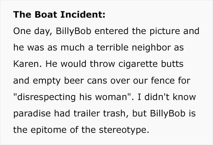 “Karen is being extra smug. She tried to push her bounds and kept coming over to our property. A talk with the cops set her straight, but she’s playing music loud and just tossing her trash everywhere.”