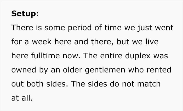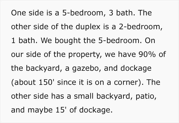 After her post went viral, u/Unique_username504 saw that quite a few people misunderstood the setup, so she made a clarification: “Let’s call our side of the duplex, Duplex OP. The other duplex is Duplex Karen,” the Redditor wrote.