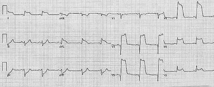 I didn’t treat this patient but I was on shift when this guy came in with tombstones on his [ekg] in the setting of chest pain. He told the ED doc, “I want a second opinion before going to the cath lab.” This ekg is unmistakable. The interventionalist had to come down to the emergency department to tell him he was having a heart attack.