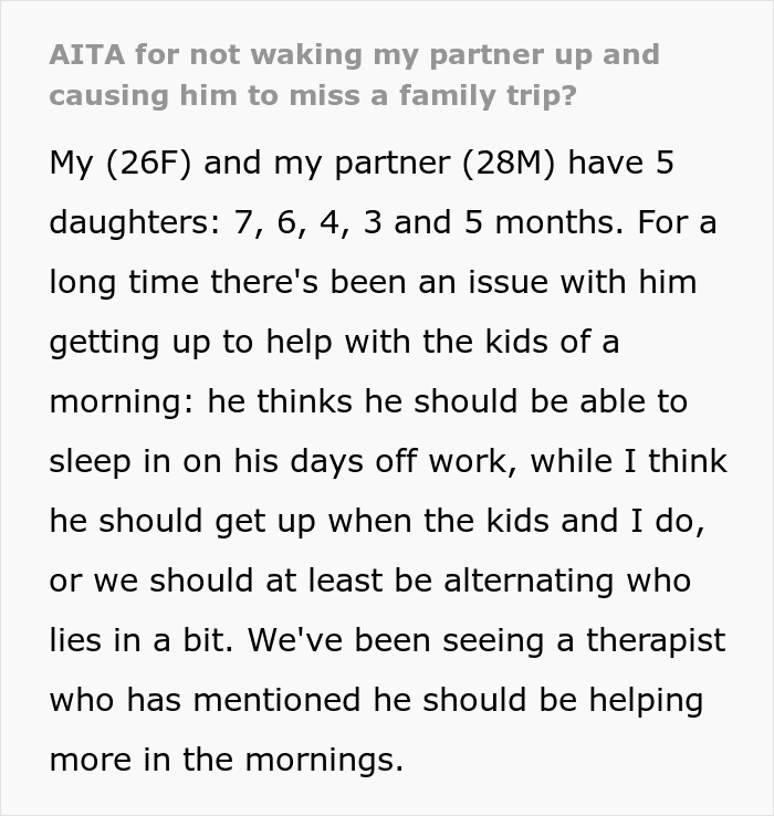 The woman started her story by revealing some of the details about her family: the woman and her 28-year-old partner are raising their 5 kids, the oldest being 7 years old and the youngest – 5 months. Having in mind how much time and effort it takes to take care of such a young bunch, the woman believes that her partner should also help with the kids as much as possible. That is especially important in the mornings when she needs to get ready herself and prepare the kids for the day. However, her significant other turned out to be of a different opinion. When the woman shared her concerns about helping with the kids, the man said that he should be able to sleep longer on his days off. The mother of 5 even confessed that this issue has been talked about during their therapy sessions and added that they all agreed that the man should be helping out more.