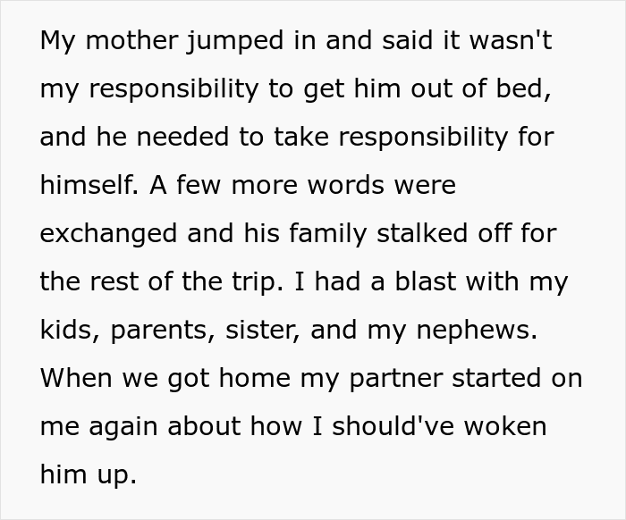 A little later, the woman received a call from her partner who was surprised that they weren’t at home and later got mad after finding out that they all left without him. He then called his own mother and told her how he was left in the morning. This is when the argument between the man’s mother and the OP’s family began. After this, the woman wasn’t sure if she really did the right thing by not even trying to wake her significant other up.