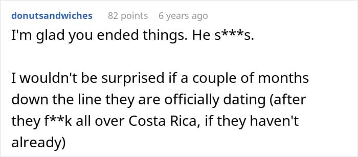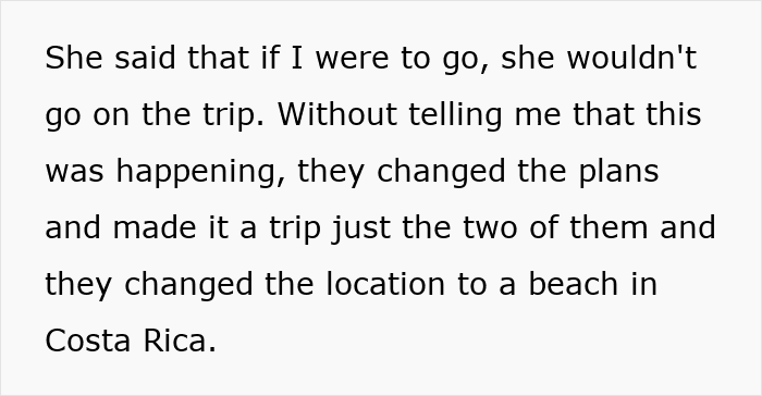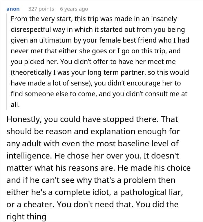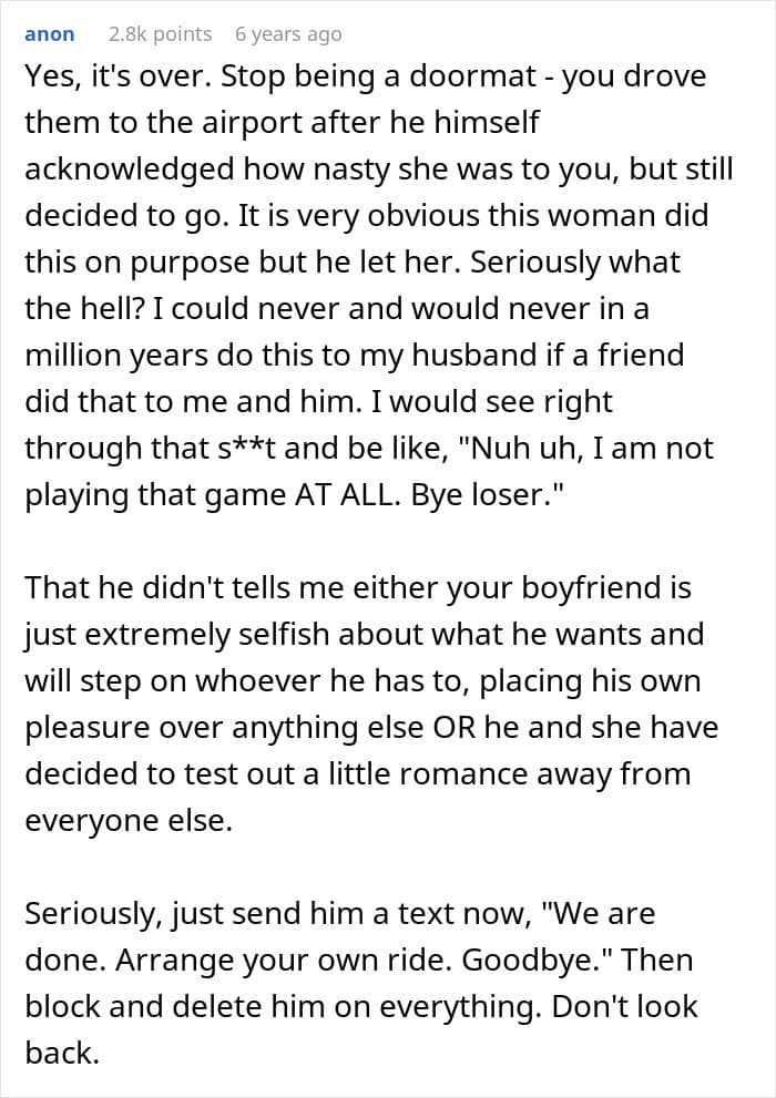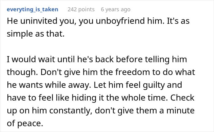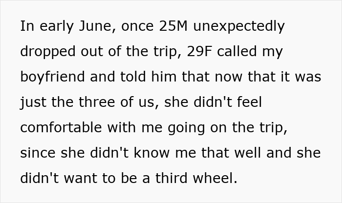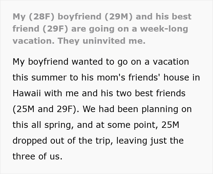 But when one friend backed out, the BF disinvited his own GF so he could go on vacation with his female best friend