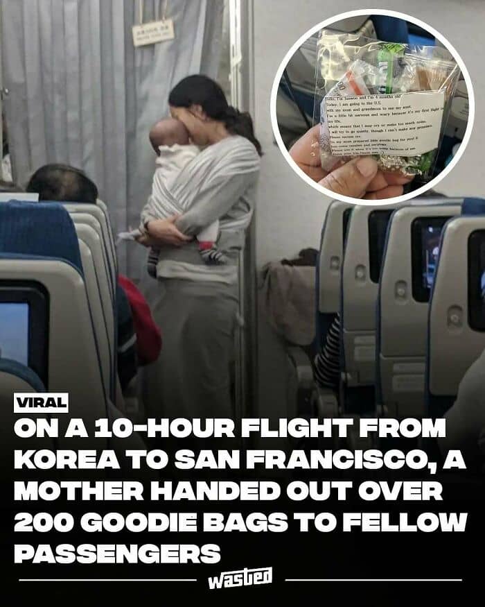 On a flight from Seoul to San Francisco, one mother went viral for a gesture that warmed hearts at 30,000 feet. Before takeoff, she handed out more than 200 goodie bags to fellow passengers—each one filled with candy, earplugs, and a printed note from her 4-month-old son, Junwoo, kindly asking for patience if he cried during his first flight.