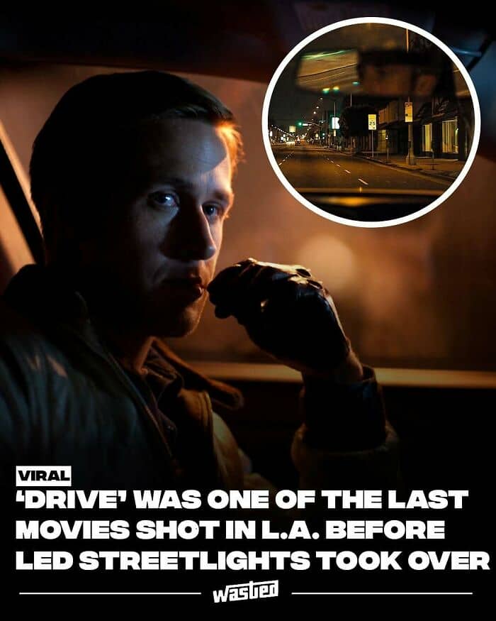 Drive unintentionally became a time capsule for a vanishing Los Angeles. Filmed in 2011, it captured the city just before a sweeping LED overhaul transformed its iconic sodium-orange nighttime glow. Between 2009 and 2019, L.A. replaced around 160,000 of its streetlights with energy-efficient LEDs, changing the city’s visual identity from warm amber hues to cooler, bluish-white tones.