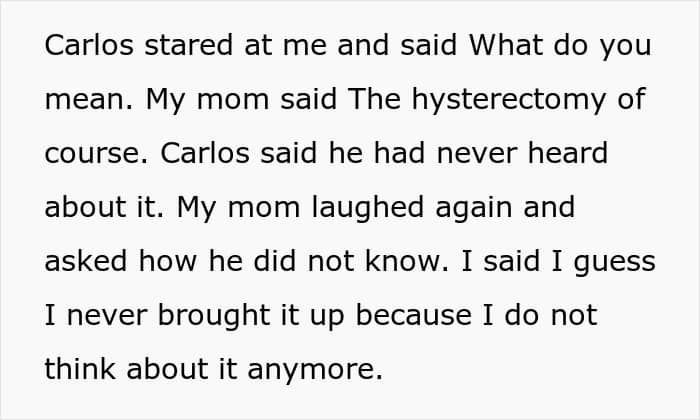 Her mom mentioned the past hysterectomy, revealing that the fiancé had never heard the full medical detail, which led him to confront her afterward
