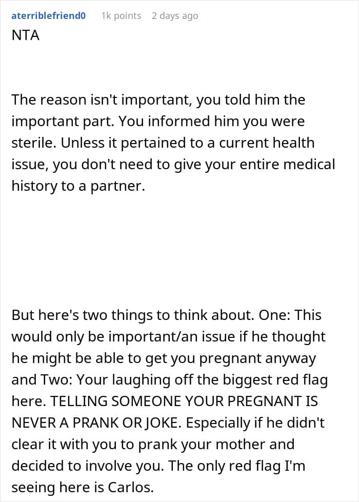 Netizens felt the fiancé had no right to be upset since he already knew the OP couldn’t have children and never bothered to ask for details. They pointed out that she had disclosed the key information early on, and it was his responsibility to ask follow-up questions if the “why” mattered to him.