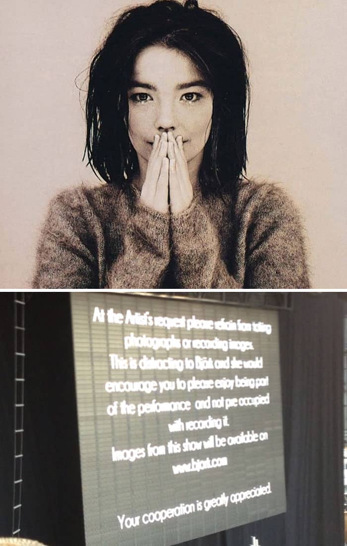 Moments before her Bonnaroo performance, Björk posted a sign requesting that attendees refrain from taking photographs or recording video. The sign stated that doing so is distracting to her and further encouraged audience members to “enjoy being part of the performance and not preoccupied with recording it.”