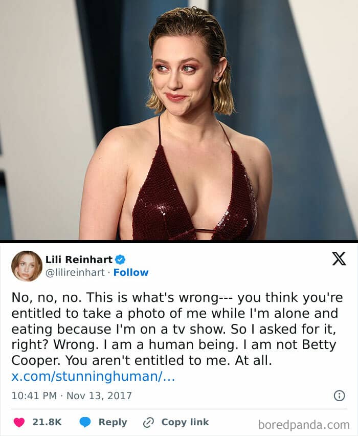 Tired of being photographed mid-bite, Lili Reinhart addressed the paparazzi directly in a tweet, reminding everyone that she’s a person, not just “Betty Cooper,” and politely stated they are not entitled to her.