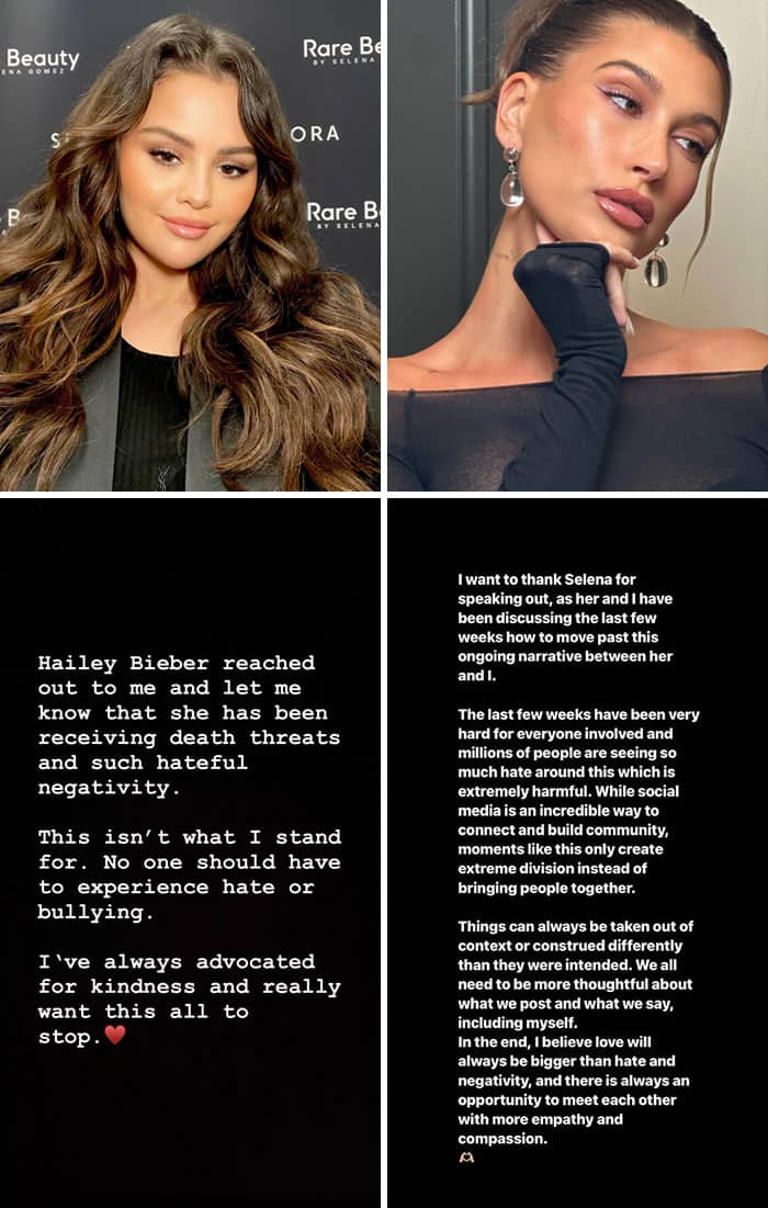 After alleged social media drama with Hailey Bieber and Kylie Jenner, Selena Gomez posted on her Instagram Story, “Hailey Bieber reached out to me and let me know that she has been receiving death threats and such hateful negativity.” She then asked fans to “stop” the “hate.”