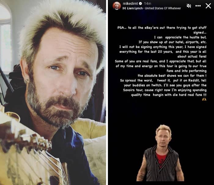 In a recent social media post, he announced that he “will not be signing anything this year” for people showing up at hotels, airports, etc. Dirnt stated that this year is “all about actual fans!” and that his time and energy on tour will be dedicated to “true fans and into performing the absolute best shows we can for them!”