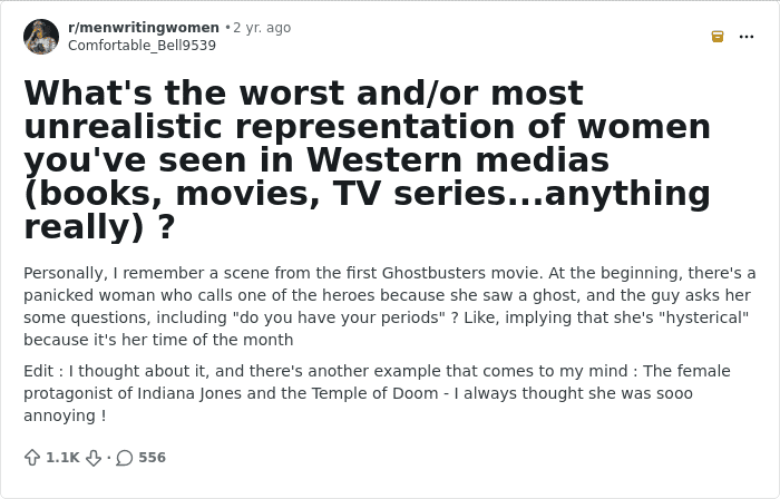 We has collected people’s hottest takes on this topic from several different threads online, where folks asked: “What’s the worst and/or most unrealistic representation of women you’ve seen in Western media (books, movies, TV series… anything really)?”