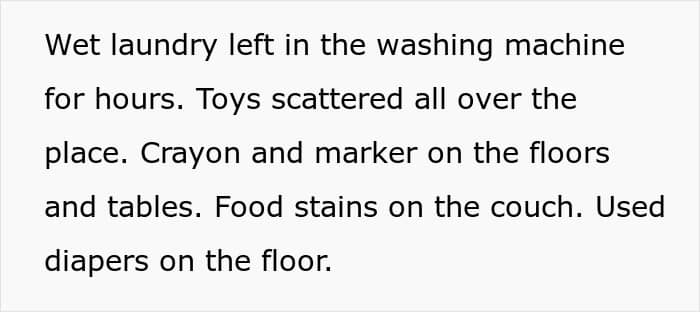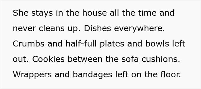 She sparked trouble by turning the whole home into a trash can. There were food crumbs all over, with unwashed utensils, bandages, soiled diapers, wrappers, and even toys just spread out everywhere on the floor. Sounds like a hygiene freak’s worst nightmare, doesn’t it? The worst part is that she never cleaned up, so OP and her mom had to do it every time.