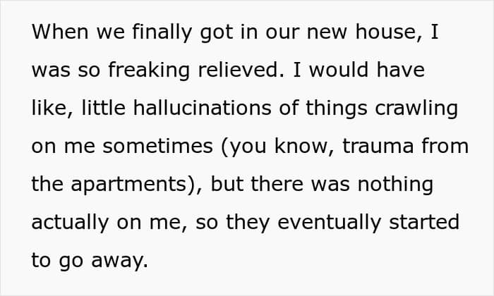 The poster was traumatized by the previous dirty apartments she lived in, so she was happy to move into a clean house with her mom