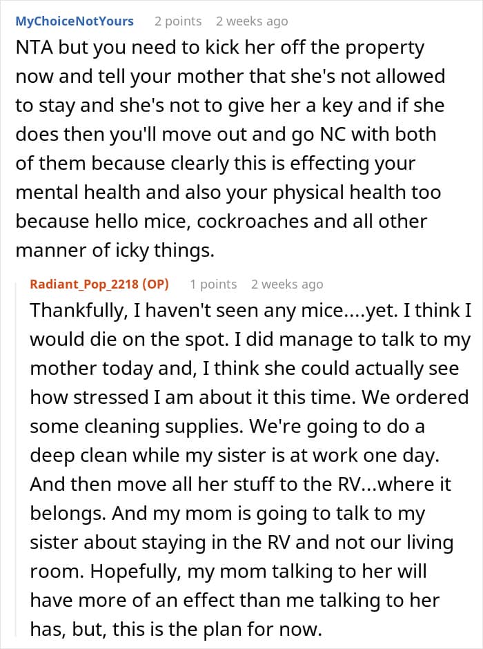 A lot of folks said that OP should just kick her out, but she clarified that the woman is going through a lot. Besides, their mom would never agree, as she’s a huge enabler when it comes to her sister. Someone also suggested that the poster needs to sit them both down to talk it out, and that does sound fair, doesn’t it? What would you do in her shoes?