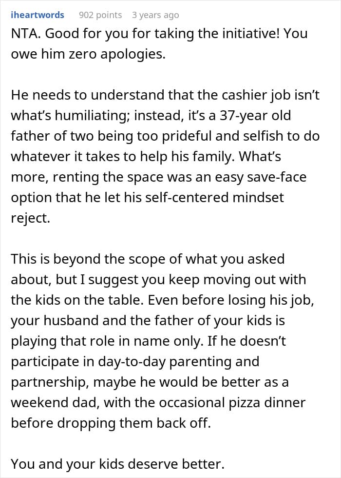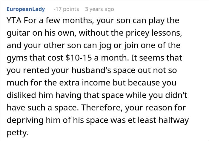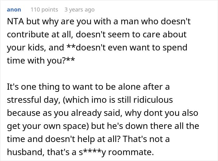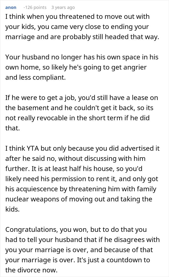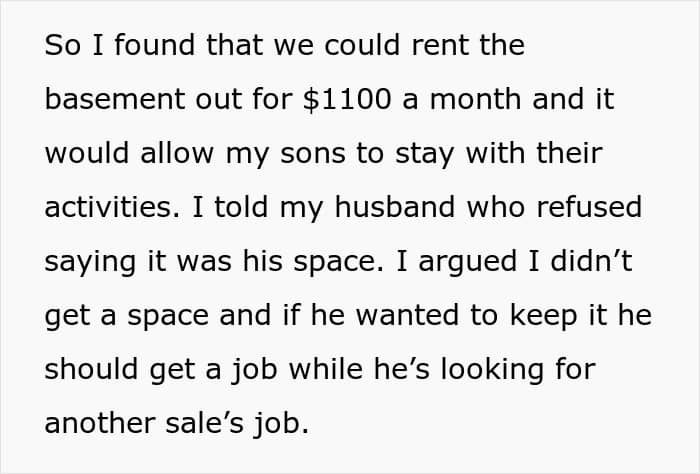 On the flip side, most women would agree that there is nothing inherently wrong with having a man cave. This woman, however, had to rent out her husband’s space in the basement after he refused to take on his responsibilities as a father and head of the family.