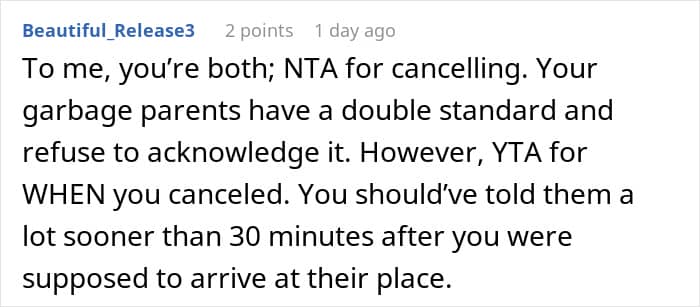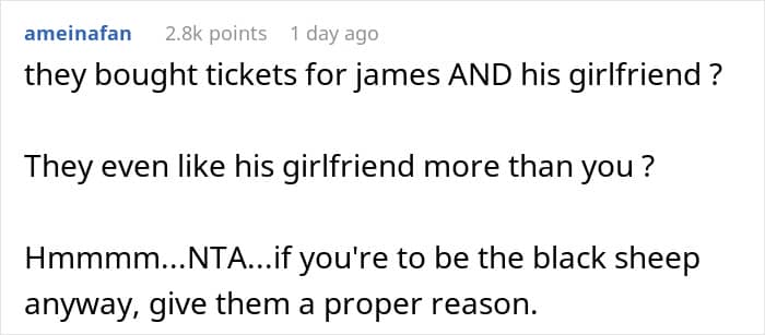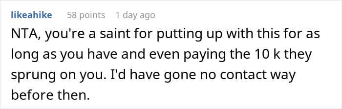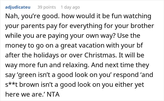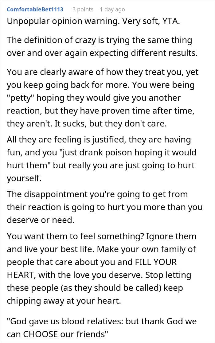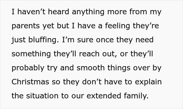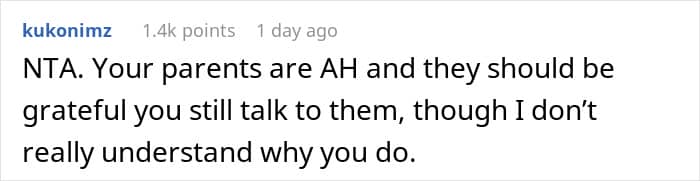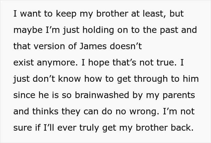 While some parents might make excuses or even justify their actions, they are also harming the relationships of both siblings, which deprives two people (at minimum) of a possible close friend. It’s selfish and cruel and it’s particularly telling that the parents see the woman’s actions as being part of a “grudge” against her brother (as described in the update) and not the direct result of her own actions.