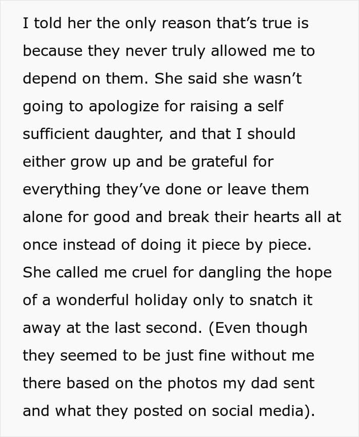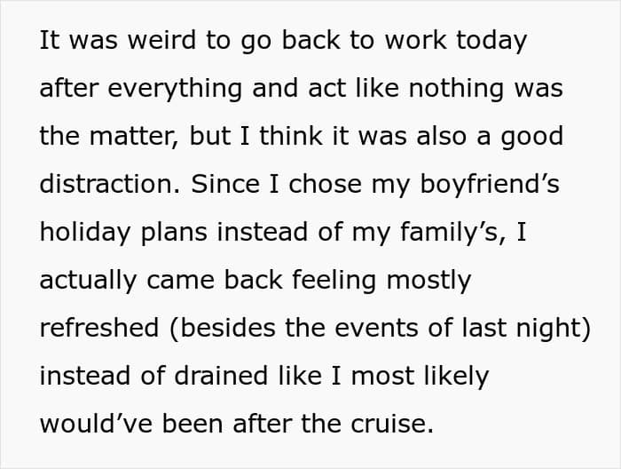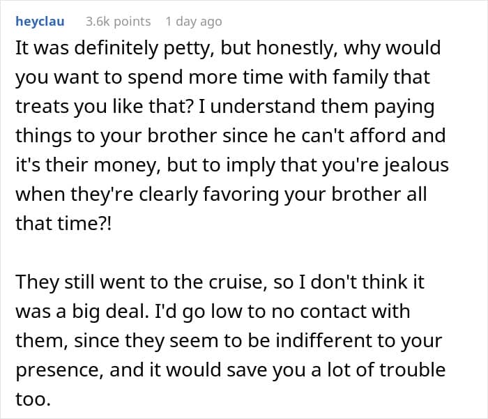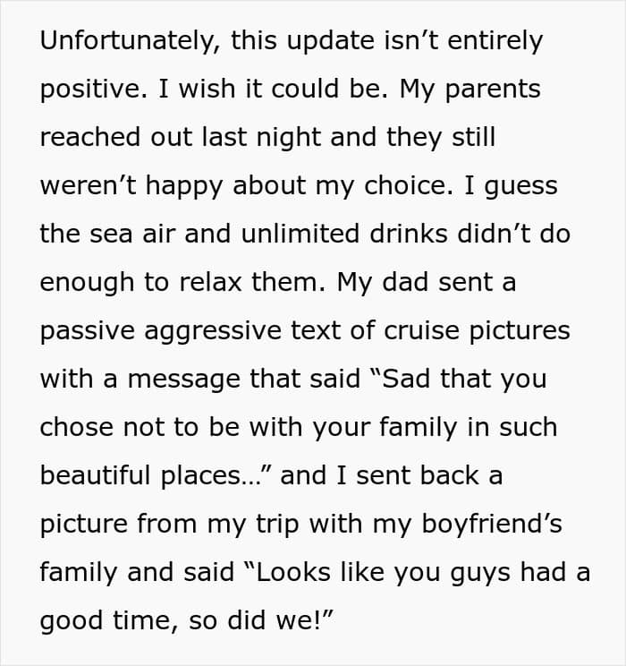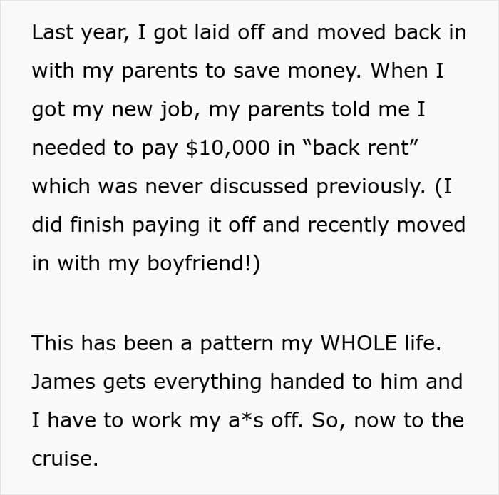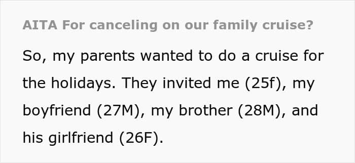 A woman got tired from her parents’ constant, blatant favoritism towards her brother, so she decided to skip out on a Thanksgiving cruise without telling them. We got in touch with her and she was willing to answer some of our questions. Later, she also shared a sizable update.